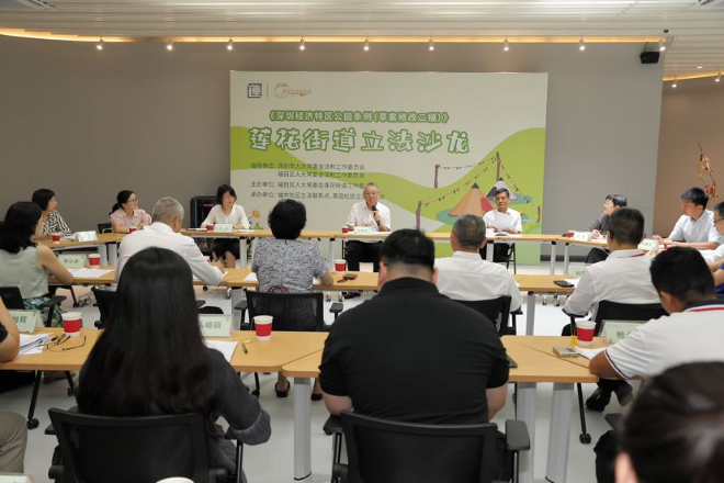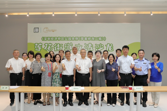 9月24日,莲花街道康欣社区景蜜公园热闹非凡,福田区人大常委会法制工作委员会联合区人大莲花街道工委,在此开展《深圳经济特区公园条例(草案修改二稿征求意见稿)》(以下简称《条例》)立法意见征集沙龙。省、市、区人大代表,莲花街道景田社区、福中社区立法联系点议事会成员,市公园管理中心相关负责人及辖区居民、特殊群体、学生代表等近50人参加。