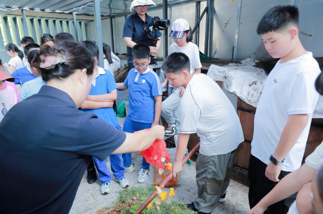 在郁郁葱葱的穰园内,市科普馆(福田馆)还开展了堆肥实践体验。期间,从带领学生们从收集落叶开始,到逐步了解堆肥过程,认识厨余垃圾价值,再到指导学生们亲身参与堆肥养护、农作物采摘与饮品制作等环节。