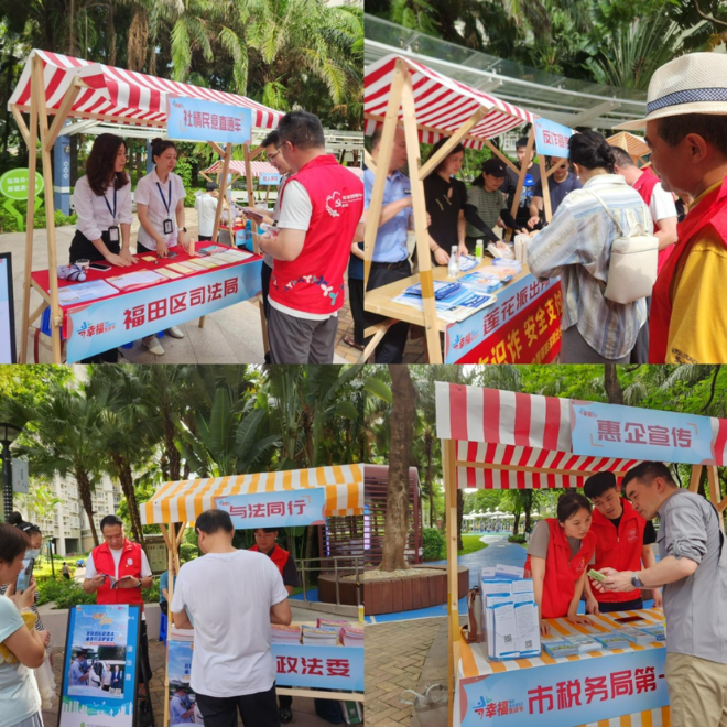 深圳市委政法委负责“与法同行”摊位,提供民法典宣传,婚姻家庭、劳动纠纷、借贷纠纷等专业的法律咨询服务,倡导保护和维护居民合法权益……此次活动还携手深圳市税务局第一稽查局认领惠企宣传摊位,为辖区企业和居民送去最新的惠企政策和税务政策福利,广受居民欢迎。