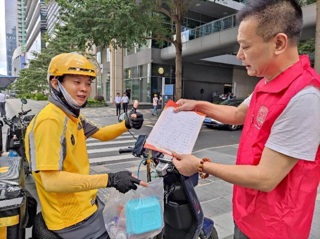 在中秋佳节来临前,福田街道CBD商圈党委联合周边的爱心企业,为辛勤劳动的新就业群体和户外工作者,送上了节日的祝福与慰问。十余名企业代表和青年志愿者走上CBD商圈街头,为穿梭在街头的户外工作者送上贴心礼包,并介绍暖蜂驿站的各项“暖心”服务。