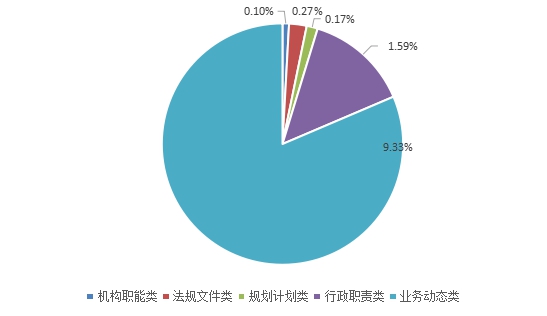 全区政府信息公开的重点是社会民生服务信息,各部门着重以民生为本,整合和优化服务资源,对政府信息进行梳理。2017年共新增和更新政府信息57316条,其中机构职能类信息58条,占总体的比例为 0.10%;法规文件类信息154条,占总体的比例为0.27%;规划计划类信息96条,占总体的比例为0.17%;行政职责类信息 909条,占总体的比例为1.59%;业务动态类信息5348条,占总体的比例为9.33%。