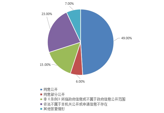 全年答复政府信息公开申请69件,其中同意公开34件,占49%;同意部分公开4件,占6%;非《条例》所指政府信息或不属于政府信息公开范围10件,占15%;依法不属于本机关公开或申请信息不存在16件,占23%;其他答复情形5件,占7%;全年无不予公开情况。