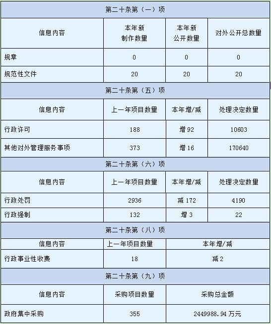 2019年共新增和更新政府信息21384条,其中机构职能类信息104条,占总体的比例为0.49%;法规文件类信息56条,占总体的比例为0.26%;规划计划类信息78条,占总体的比例为0.36%;行政职责类信息143条,占总体的比例为0.67%;业务动态类信息4455条,占总体的比例为20.83%。此外,还通过不同渠道和方式公开政府信息,其中2019年政府公报发布信息4期共18条信息,政务微信公开信息1233条,举办新闻发布会22次,组织政府网站在线访谈12次,政策解读稿件发布33篇。