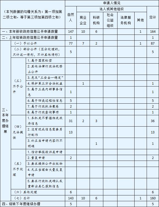 1.申请受理情况。2019年全区共受理政府信息公开申请165件,其中自然人申请148件,占90%;法人或其他组织申请17件,占10%。全年答复政府信息公开申请160件,其中予以公开87件,占54%;同意部分公开5件,占3%;不予公开10件,占6%;无法提供占50件(包括本机关不掌握相关政府信息和没有现成信息需要另行制作以及补正后申请内容仍不明确),占31%;不予处理2件(均属于重复申请),占1%;其他处理6件,占4%;结转下年度继续办理5件。