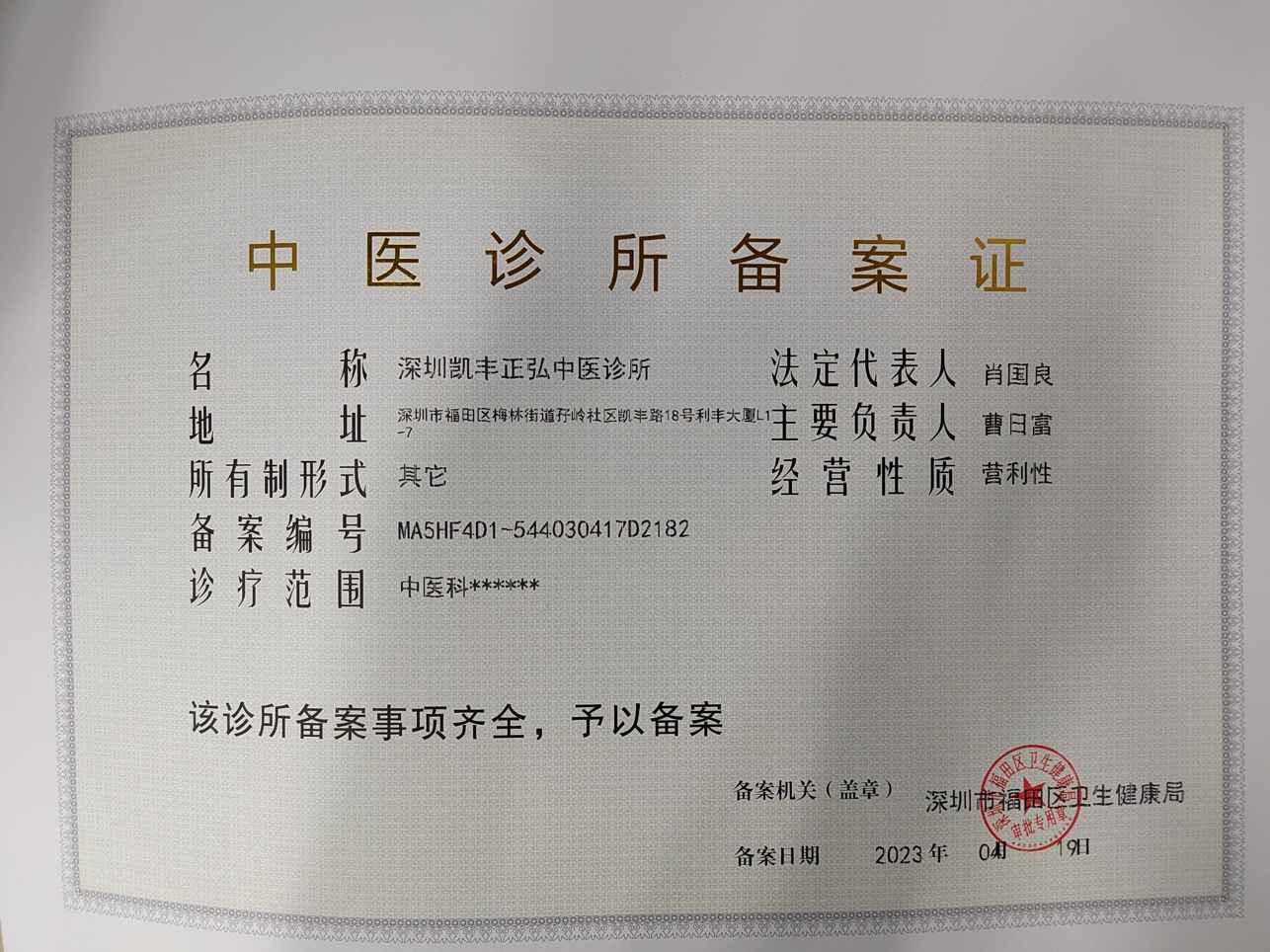 深圳凯丰正弘中医诊所的公示