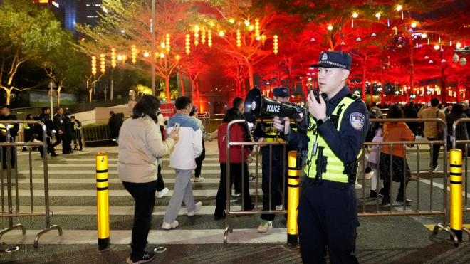 今年福田市民中心春节灯光秀表演(以下简称“灯光秀”)分为春节特别版、辉煌新时代两个主题,在常规版本的基础上新增《新春龙灯点亮秀》序曲,合计播放时长约20分钟。整场灯光秀运用寓意春节喜庆吉祥的大色块、光波速度、线条、粒子等充满活力的元素,通过数字光影的画面、语言与音效无缝结合,绘就“金鹏展翅”“金龙冲天”“天降祥云”“恭贺新春”等富有张力的文化艺术视听画卷,诠释深圳创新之城的城市风貌,充分激发市民的城市认同感、归属感、自豪感,同时,让四方游客在深圳这座城市流连忘返。 在这烟花绚烂的时刻,有一群人还坚守在岗位上,保障灯光秀安全、有序地进行。“晚上六点半,灯光秀正式开始之后,民警也没歇着,除了要时刻关注活动现场有没有意外发生,还要尽快地疏导预约了下一场次的观众,让他们以最快的速度找到入口,避免在路面聚集。”深圳市福田区公安分局反恐怖与机动训练大队副大队长麦华伟说,他和同事从大年三十开始,一天都没有休息,参与到灯光秀的安保任务中。 在现场可以看到,此次灯光秀共设置了两个入口、六个出口,每个出入口都安排了警员值守,及时疏导人群,维持现场秩序。截至大年初三(2月12日),灯光秀共吸引了13万余人次观看。为保障灯光秀顺利进行,为市民营造安定、喜庆、祥和的节日气氛,此次福田分局共投入安保警力1500余人,并且联合深圳市公安局轨道交通分局、深圳市公安局交警支队福田大队、福田区城管局、福田区消防救援大队、福田区卫生健康局等单位严格落实各项安全管控措施,守护市民安全。 据悉,从2月12日起,福田中心区灯光表演的播放场次已调整为18:30、 19:30、20:30、21:30,每晚增至四场。需要注意的是,在市民中心广场观看灯光秀需要预约。 福田警方温馨提醒:为确保灯光秀期间市民中心广场、莲花山顶广场及周边秩序安全,请广大市民和游客尽量乘坐公共交通工具出行,观看时要注意安全,看护好老人、小孩,保管好随身财物,听从现场工作人员指挥疏导,共同维护安全、文明、有序观赏环境。市民游客现场若有需要,可向现场执勤警力寻求帮助。节假日期间,福田警察都在岗在位,为市民群众和游客朋友们提供安全有序祥和的社会氛围,祝大家春节假期出行游玩愉快。