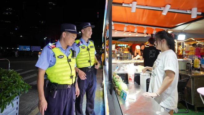 本次行动全市公安机关共检查场所4173个,巡查重点部位1577个,抓获各类违法犯罪人员369人,在逃人员46人,排查整改各类安全隐患905处,查处酒驾醉驾66起,查处飙车炸街7起。 小桌贴打油诗出圈 温馨提醒暖人心 7月6日19时,深圳的夜色尚浅,天空中最后一抹余晖还未消逝,霞光打在深圳河上波光粼粼,此时的深圳,相比白天空气中热度减了不少,市民开始出街遛弯、结伴跑步、寻觅美食……在这片繁华与喧嚣的城市中,商业圈、美食街、马路边,随处可以看到警灯闪烁,还有警察们巡逻的身影在街头巷尾走过,让出行的市民游客感到无比安心。 趣园食街藏身深圳最老社区之一的园岭新村内,近百米见方的地方,挤满了粤式美食馆子,生蚝、烧烤、火锅、冰粉、水果茶……应有尽有的“老味道”,也是老园岭人时常光顾的地方。 “周末是和朋友聚餐吗?最近大家都有看欧洲杯吧?”深圳市公安局福田分局通新岭派出所社区警务队副队长李峻率队开展完例行安全防范措施检查后,站在街头热情地和市民打招呼:“小酌怡情,大家喝酒了切记别开车,安全第一。”“放心,我们过来喝酒就没开车,谢谢你们提醒!”李先生是安徽人,来深圳十多年了,这周有空约朋友出来吃烧烤看球赛。 “相聚饮酒莫相劝,醉酒出事同桌担。劝君少喝一杯酒,相互提醒平安走。”“聚餐小酌情谊有,喝多醉酒易出丑。滋事打架要拘留,酒醒后悔泪满流。”深晚记者发现美食街的店铺餐桌上,贴有“莫劝酒”“莫贪杯”的小桌贴打油诗,细节之处尽显人文情怀。“打油诗很有趣。”市民林先生说和朋友等待上餐时就看到了,读完感觉很温馨,大家自觉也会相互提醒。“在福田辖区的宵夜档、酒吧等人员密集区,我们都贴了这类提示,就是想用一种温暖有趣的方式提醒大家。”福田分局相关负责人表示。 24小时视频巡逻 守护人间烟火 ▲民警在辖区夜市开展巡逻防控工作 22时,夜色渐浓,福田口岸人潮涌动,三五成群的旅客拖着行李箱陆续过关去香港或来深圳。福强派出所福田口岸联勤联动指挥部四级高级警长陈小华带领队员在口岸场所巡逻,从早上7时一直忙到现在,脚步不停。“口岸具有特殊性,人流量大,出入频繁。”他说当天人流量达到18万人次,来往旅客比较多,我们首要做好服务和人流疏导。 “除了福田口岸,我们辖区还有网红美食街水围村,不仅是深圳吃货的打卡地,也吸引了很多香港人和外国人慕名前来。”福强派出所所长朱志龙表示,社区警务室联动村里物业、义警,在水围村建立了全市最早的应急作战单元和“十户联防”队伍,最大化发动群防群治力量,解决先期处置“最后一公里”问题。 走进福田水围村,可以看到浓浓广府风情的老牌坊和骑楼,道路两边传统小吃、餐饮名店、格调酒吧和咖啡馆林立,午夜时分依然灯火通明、人声鼎沸。“大家在美食之余喝点儿小酒,难免醉意熏熏发生纠纷,所以我们除了民警步巡,还通过24小时视频巡逻实施主动警务、预防警务,根据区域划分为一类二类,将重点放在下半夜,提前做好治安防范。水围村还设有醒酒室,专业规范处置涉酒警情,最大限度保证醉酒人员安全。”朱志龙说。 夜色愈深,闪烁的警灯愈发明亮。随处随时可见的警灯、警车、警察,已成为深圳夏夜的一道风景线,默默守护着这座城市的人间烟火。