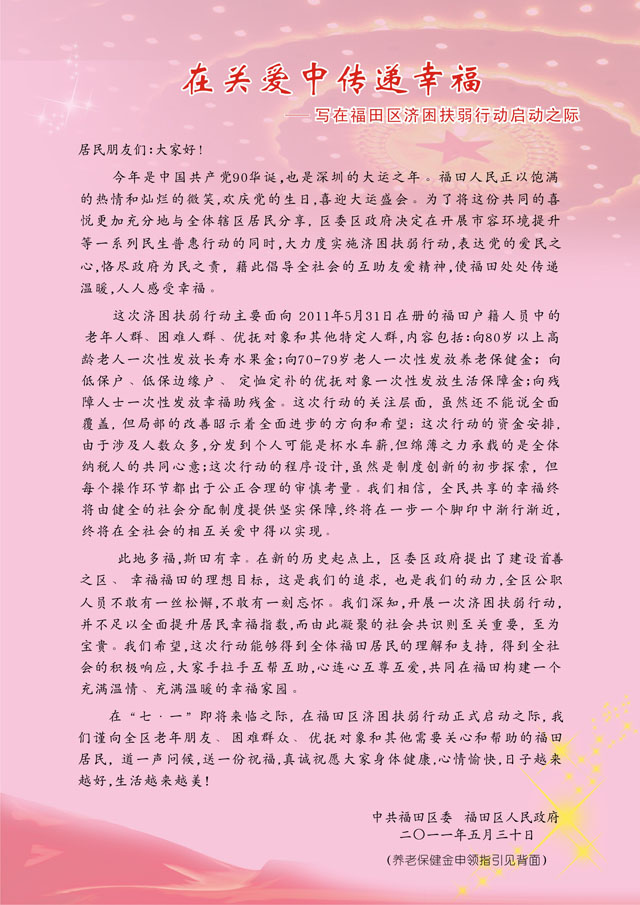 份济困扶弱行动宣传单张及养老保健金发放操作指引,向辖区居民宣传济困扶弱行动