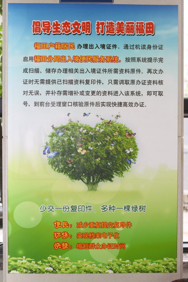 作为福田区年初承诺的20项民生实事之一和“2013年福田区政府白皮书”28项任务之一,福田公安分局“建立群众办证电子档案,实现市民办证免交纸质材料”这项便民举措已提前完成,获得了省公安厅出入境管理局表扬。今年以来,福田公安分局不断开拓创新,苦练内功,通过信息采集、平台建设优化了工作流程;勤修外功,通过开发便民服务系统、创建网上预约网站,切实方便了群众。