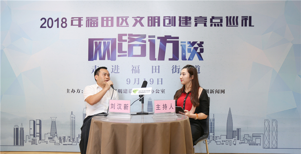 9月19日上午,“2018年福田区文明创建亮点巡礼”系列网络访谈第六期节目在福田街道白领e家举行。福田街道党工委副书记刘汉新在节目中与市民和网友代表面对面畅聊福田街道党工委在创文过程中发挥的重要作用,并针对市民关心的老旧住宅小区提升改造,深圳会展中心未来将作何用等热点话题进行了一一回应。资深媒体人、深圳新闻网副总编辑周海斌作为本次访谈的联动点评嘉宾出席了此次活动。