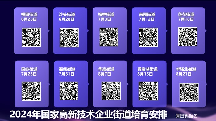 为协助福田辖区科技企业申报国家高新技术企业认定,我局定于6月至8月在分别于园岭街道、南园街道、福田街道、沙头街道、梅林街道、华富街道、香蜜湖街道、莲花街道、华强北街道、福保街道召开2024年福田区国家高新技术企业培育辅导会。通知如下: