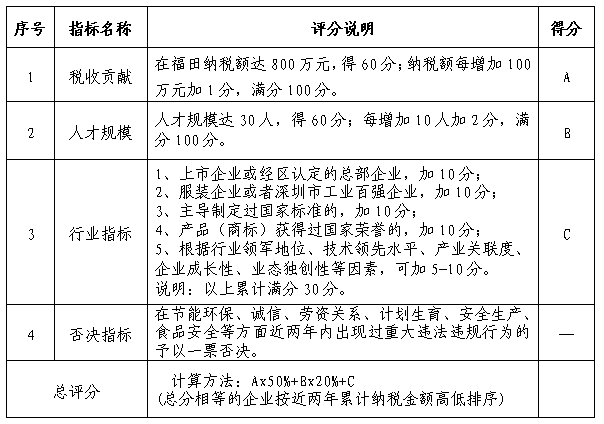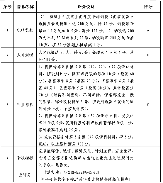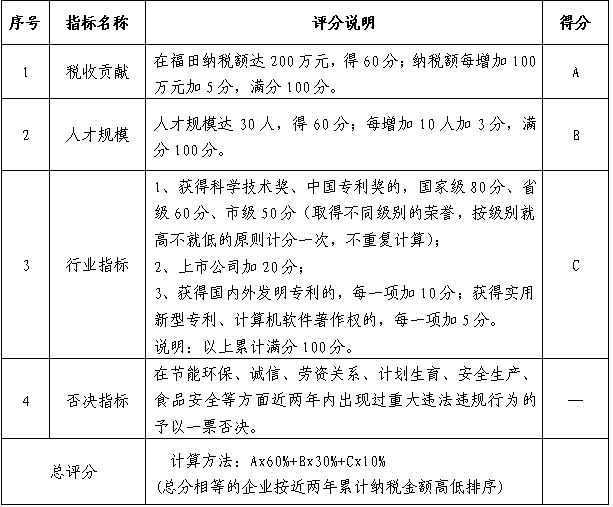 税收贡献、人才规模、行业指标按照评分说明计算出分数(A、B、C),再分别按权重比例(60%、30%、10%)计算出得分(A×60%、B×30%、C×10%),满分分别为60分、30分、10分。具体细则如下: