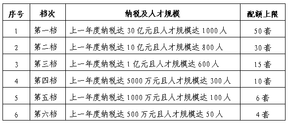 根据企业纳税和人才规模情况,获得配售资格的企业(市、区年度重点引进企业除外)的申购额度原则上不超过50套(具体配额控制上限见下表)。同等条件下,总部企业配额原则上不低于其他类别企业的配额数量。放宽条件的类别,配房数额不得高于人才数的1/10。