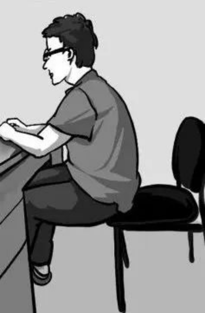 错误坐姿危害大 错误坐姿1:驼背坐姿 驼背坐姿时,人的肩膀总是会不自觉地向前倾,胸部轮廓塌陷,失去下背部弧度,导致驼背和肩膀前屈,这样会导致胸部肌肉松弛无力,后背肌肉紧张,从而使人感觉后背酸、僵硬和无力。颈椎骨失去了肌肉的支撑力量,这一段前凸的颈椎生理弯曲,就会随外力逐渐变直,甚至反向弯曲。 错误坐姿2:瘫坐在椅子上 身体瘫坐在椅子上,全身受力最大的是腰椎。此时腰椎间盘所承受的负荷是坐姿的2倍,平躺的6倍,而其没有承托力,整体下沉,身体的中轴线跟着后移,导致脊椎畸形。 这个姿势也会导致骨盆后倾,坐骨前移。长久保持这个不良坐姿会让腰部肌肉和韧带疲劳,没有了肌肉和韧带的保护,可能引发腰椎间盘突出。 错误坐姿3:跷二郎腿坐姿 在跷二郎腿时,左右两边受力不均衡,坐骨的高度也会产生偏差,坐骨与骨盆左右不平衡,容易造成骨盆旋转导致脊椎旋转。这使腰部肌肉拉伸,腰部受力不均,局部肌肉处于紧张状态,脊椎左右两边的软组织被动失去平衡。 长期这样坐,容易出现背部肌肉疲劳、酸痛等症状,严重者还会造成脊椎扭曲、侧弯或腰椎病。膝关节长时间保持一种扭曲的状态,会引发疼痛,关节灵活性降低。双腿长时间互相挤压,容易造成腿部血液循环不良,压迫神经,引起相关疾病。跷二郎腿时,腿部外侧肌肉长期牵拉,容易造成髂胫束紧张,出现下肢疼痛。 错误坐姿4:歪坐坐姿 长时间坐着偏向一侧,会使患侧肌肉受挤压,另一侧肌肉受牵拉,久而久之可能导致肌肉拉伤或者无菌性炎症,出现另一侧肌肉的疼痛、酸胀、僵硬以及拉扯感。 还会导致身体重心偏向一侧,两侧髋关节不对称,长久下去,骨盆正常的倾斜度会改变,偏向用力的一侧,出现骨盆倾斜,导致脊柱偏向一侧,严重者还可能会出现脊柱侧弯。除以上部位出问题,还可能导致肩膀倾斜、锁骨不对称。 错误坐姿5:托腮坐姿 托腮坐姿和跷二郎腿时一样,左右两边受力不均衡,坐骨的高度也会产生偏差,坐骨与骨盆出现左右不平衡,容易造成骨盆旋转。 另外,采取这种姿势时,颈椎处于过度弯曲状态,颈部肌肉过于紧张,容易引起颈椎病,同时也容易引起腕关节损伤。 错误坐姿6:三分之一板凳坐姿 这种坐姿或许会让你看起来很有精神,但时间过长,会造成骨盆前倾。对久坐族来说,这是一个对腰部伤害很大的姿势。 正确坐姿有讲究 挺胸收腹。坐直时腰椎承受平时约1.5倍的压力,而前倾或者后仰,腰椎要承受2.5倍压力,所以坐着的时候要挺胸收腹,坐正时椎间盘所受到的压力最小。 尽量在腰部使用靠垫,腰部紧贴靠垫。腰枕可以使腰部得到更好的依托,从而缓解腰部肌肉紧张,减轻腰椎压力。 正确坐姿可以简单概括为“三个直角”。 膝盖处形成第一个直角,也就是屈膝,大腿和小腿之间需要保持90~110度。 大腿和后背是第二个直角。 手臂在肘关节形成第三个直角。 膝盖后方与座椅前面留有一个拳头大小的距离,保证大腿能平行于地面。双脚脚踏实地,让腰部从上到下有个支撑,悬空的下肢会让腰部受力加大。有扶手的椅子,可以把小臂屈曲成90度左右放在扶手上面;没有扶手的椅子,可以把手臂放到桌面上,肩膀自然下垂。 正确坐姿 如果使用电脑,在正确坐姿基础上,还需要我们双眼目视前方,视线与电脑顶端或显示屏的上1/3处保持平行。屏幕太低,颈部压力增加。屏幕太高,颈部也容易前倾,造成颈椎不适。屏幕和眼睛的距离也不能太近,以50~60厘米为宜,不然会造成眼睛酸痛,加重眼部的疲劳。