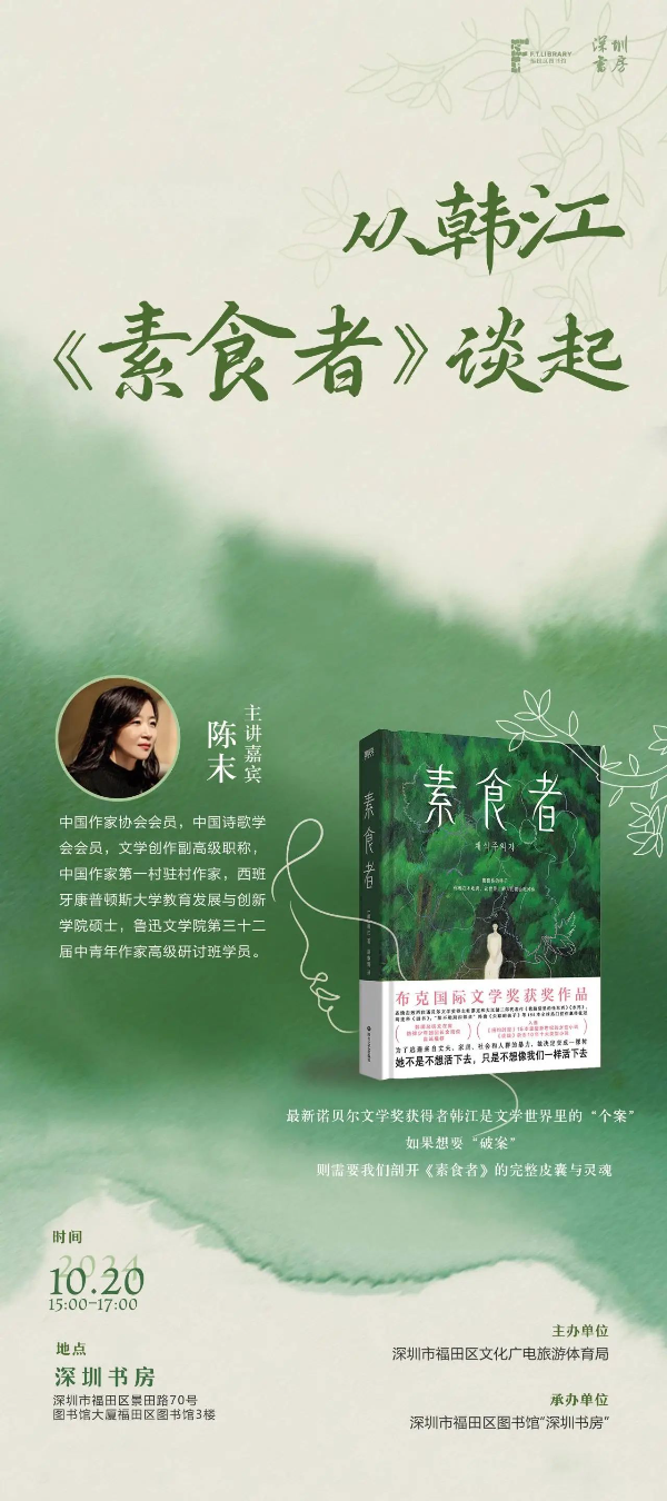 活动内容:最新诺贝尔文学奖获得者韩江是文学世界里的“个案”,如果想要“破案”,则需要我们剖开《素食者》的完整皮囊与灵魂。本期分享,深圳作家、诗人陈末将带来对韩江作品的解读。