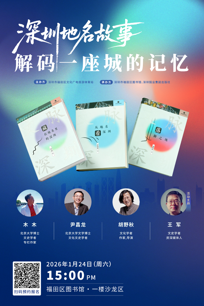 活动内容:近日,第十二届“深圳十大佳著”(非虚构类)评选结果公布,“文脉·深圳”丛书表现亮眼,《从地名看深圳》《落脚之地》《藏在地名里的深圳》三部作品同时入选。三本书,三个视角,以文化读本揭示深港合作轨迹,展现一部深圳地名演变的微缩城市史,生动诠释移民文化与创新精神的融合发展。1月24日下午,让我们一起聆听三位入选著作的作者,带领我们解码一座城的记忆。