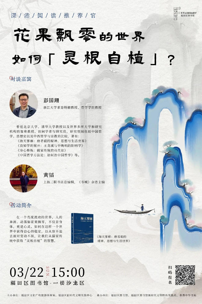 活动内容:在一个高度流动的世界,人的奔波、动荡如花果飘零,这份飘零不仅关乎身体,更关乎心灵。如何在这样的世界中获得内心的稳定,以从容不迫的姿态面对变动不居的一切,让我们从儒家传统中汲取“灵根自植”的智慧。