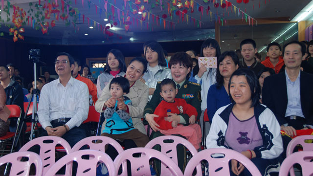 黄漫娥副区长、章俊政委与福利中心的小朋友一起观看文艺表演