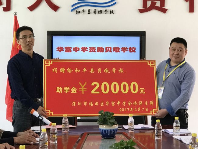 4月7日上午,华富中学在和平县贝墩学校举行简短的捐赠仪式,将该校师生募捐的两万元爱心款,捐赠给贝墩学校作为困难学生助学金,并举行了班主任工作交流活动。这是该校近年来对口帮扶活动的举措之一,此举一方面帮助了贝墩学校家庭困难学生的成长,另一方面也是对华富中学学生进行的一次爱心教育。