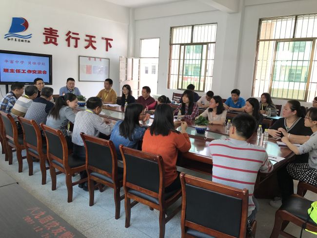 贝墩学校位于粤北和平县贝墩镇,为九年一贯制学校,现有 31个教学班,1425名学生,其中80%以上为留守少年儿童。针对如何对留守少年儿童进行有效教育,华富中学一行与贝墩学校的班主任进行了探讨与交流,并就后续如何有针对性地开展留守少年儿童家庭教育指导,如何开展两校的学生交流进行了探讨。(文/汪信宏)