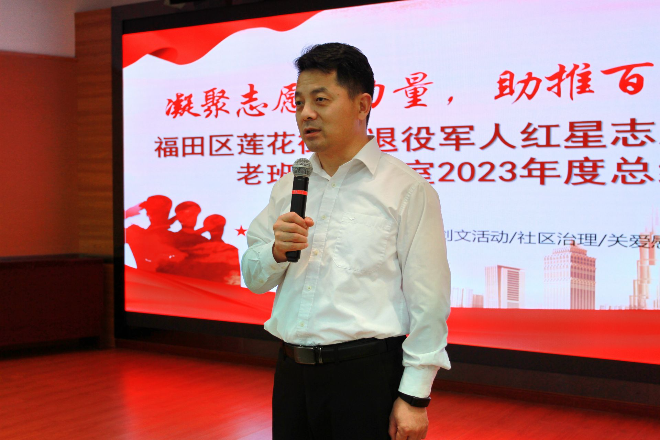 为凝聚志愿者力量、助推“百千万工程”高质量发展,增强辖区广大退役军人幸福感和获得感,12月26日下午,莲花街道召开2023年度退役军人红星志愿服务队暨老班长工作室总结会。莲花街道党工委书记范磊,福田区退役军人事务局副局长谭力,街道党工委委员、武装部部长袁庆峰,福田区志愿者联合会副秘书长王伟等参会。