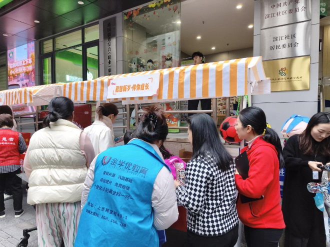“金学优教育咨询”与“艾丽思教育咨询”摊位前,老师们结合各自专业特色,通过课程展示、成果案例等方式,向家长传递科学教育理念。他们耐心解答关于兴趣培养、学习习惯养成等个性化问题,为居民提供专业细致的指导。