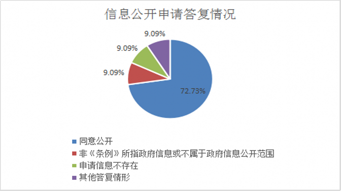 本局2018年全年答复政府信息公开申请11件,其中同意公开8件,占72.73%;非《条例》所指政府信息或不属于政府信息公开范围1件,占9.09%;申请信息不存在1件,占9.09%;其他答复情形1件,占9.09%;全年无不予公开情况。