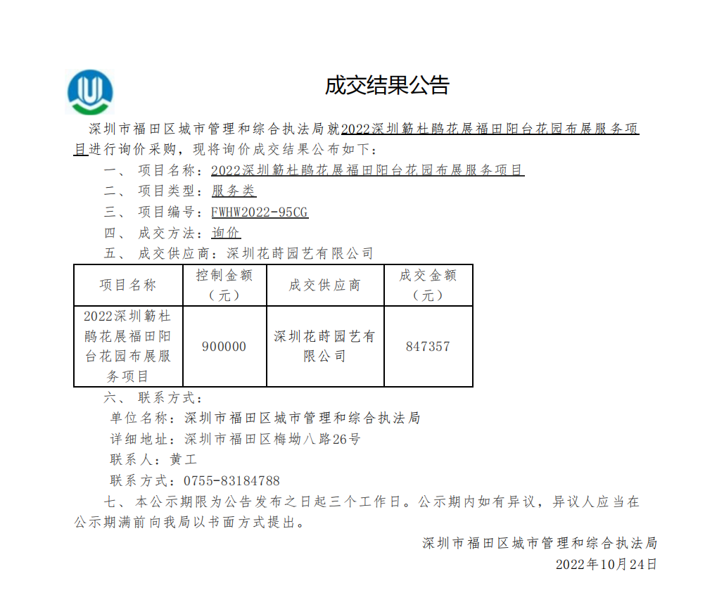 福田区城市管理和综合执法局关于2022深圳簕杜鹃花展福田阳台花园布展服务项目成交结果公告