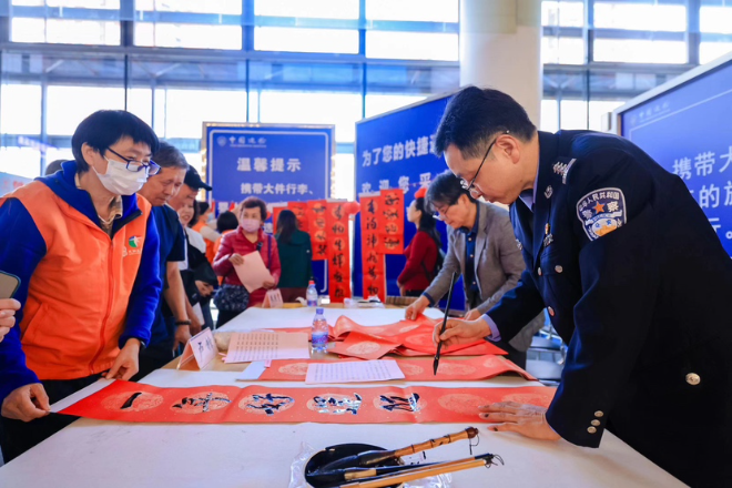 一旁的长桌前,几把剪刀、数张红纸,两位非遗剪纸传人灵活地转动着手中红纸,剪刀起合间、纸屑纷飞间,一幅栩栩如生的“福”作品在大家惊叹声中展开。不少旅客在老师教学下现场体验剪纸中的年味,一张张红纸在数次折叠、裁剪下,变成了一幅幅承载着喜悦和愿景的精美作品。