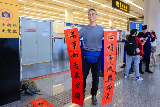 手捧着自己书写的春联作品,来自马来西亚的华人张先生激动地和民警交谈起来。原来,张先生一家已经4年没有回中国过年,全家人掰着手指头盼着春节回中国老家过年,“一入境就感受到春节的气息,春联、福字、剪纸,太有中国的味道了,过年就是要回家,也祝大家新春快乐!”