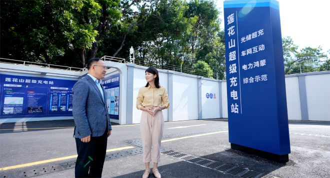 莲花山超充站是全国首个“光储超充+车网互动+电力鸿蒙”的多元综合示范站,配置了27个充电桩,能同时满足46辆车充放电,是大湾区目前最大规模的车网互动示范站。在这里“一秒一公里”,不到15分钟甚至更短的时间就能充满电,实现“一杯咖啡,满电出发”。