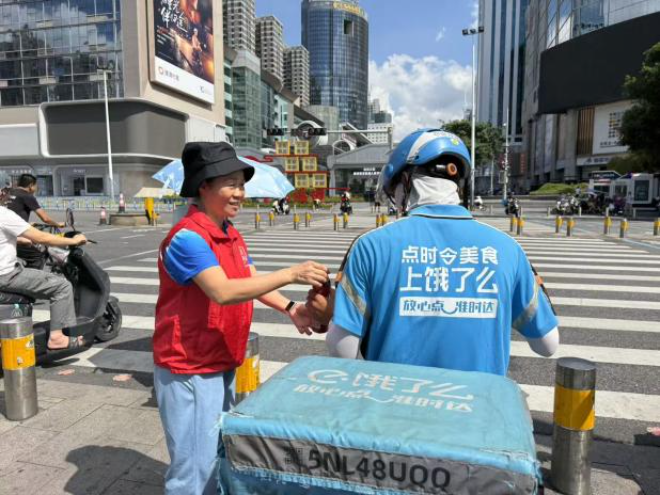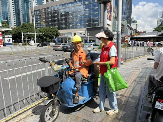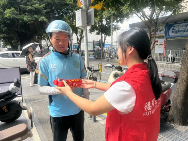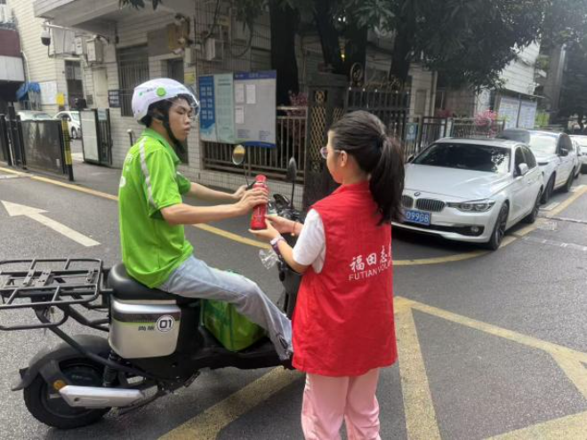 当天,4支志愿小组穿梭在华强南路、华发南路、爱华路、松岭路及深南大道等辖区主干道,累计为300余名新就业群体工作者送上清凉饮品与防暑物资。青少年志愿者小张表示:“看到快递叔叔接过饮料时的笑容,我觉得特别有意义,以后还要参加这样的活动。”