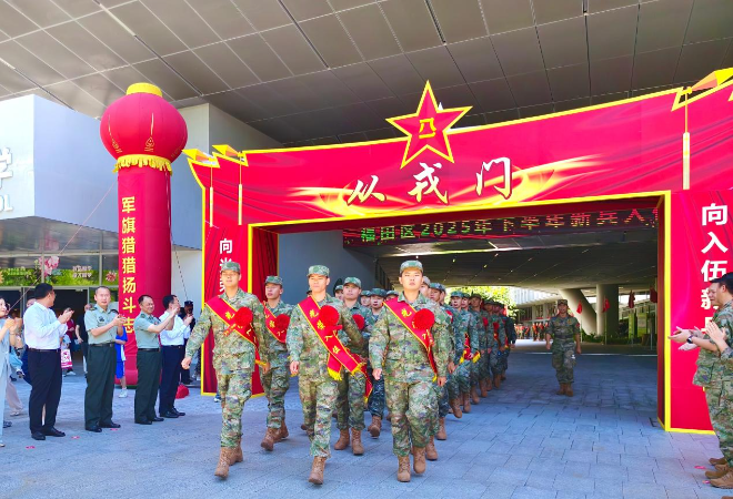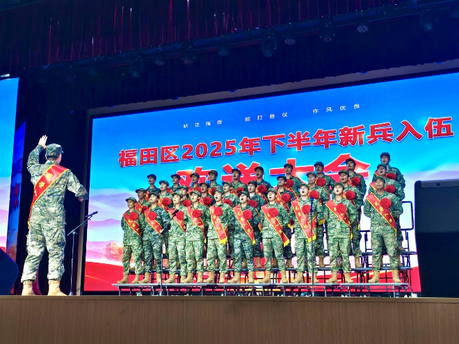 演出结束后,福田区人武部王骏宣读了《福田区2025年下半年新兵入伍决定》,参会领导为入伍新兵佩戴大红花及绶带、赠送纪念品,并勉励全体新兵珍惜入伍锻炼的机会,时刻牢记自己肩负的光荣使命和神圣职责。