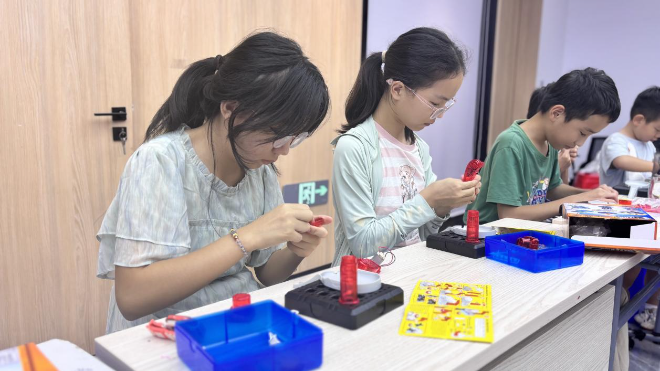 从探索《磁力与浮力的奥秘实验》到亲自动手参与《蜂鸣车挑战赛:穿越声波的竞速》;从解码影像科学《DIY三维动画》到揭开《绘图仪的秘密:机械与编程启蒙》;再从制作《创意电子钢琴》体验音乐与电路的邂逅,到操控《旋转电磁陀螺》感受能量的奇妙转化……每一站课程都主题鲜明、形式新颖,真正实现了“做中学,玩中学”。
