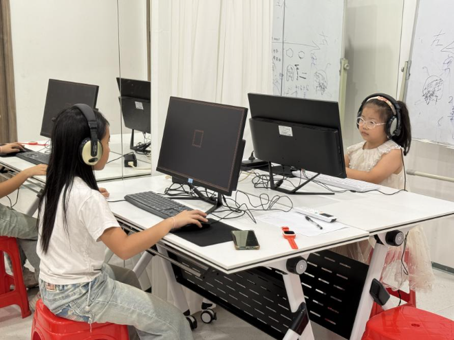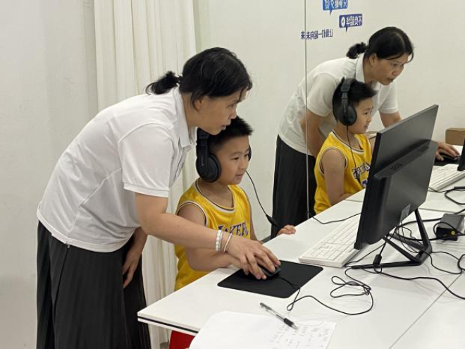 活动现场,在儿童测试区,孩子们在社工与志愿者的引导下有序排队进入房间,坐在电脑前参与由读写易科技设计的专注力游戏测试。有的通过“追踪移动的卡通小鱼”锻炼视觉专注力,有的在“按顺序点击数字方块”中提升注意力稳定性。测试结束后,系统还会生成简易的专注力分析报告,便于后续工作人员对报告的解读。