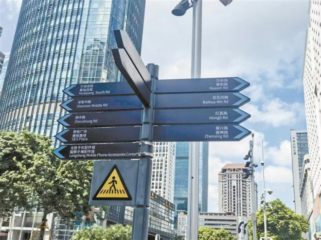 为应对持续增长的国际化客流,华强北街道全面焕新华强北步行街的标识标牌,关键节点实现多语种覆盖:街区道路的每根电线杆均配备清晰的方向指引;每个地铁口都设有巨幅双语地图,清晰标注酒店、购物中心、美食中心等场所位置;辖区内所有商用电子屏也加速推进“双语化”改造,确保语言识别“无障碍”。