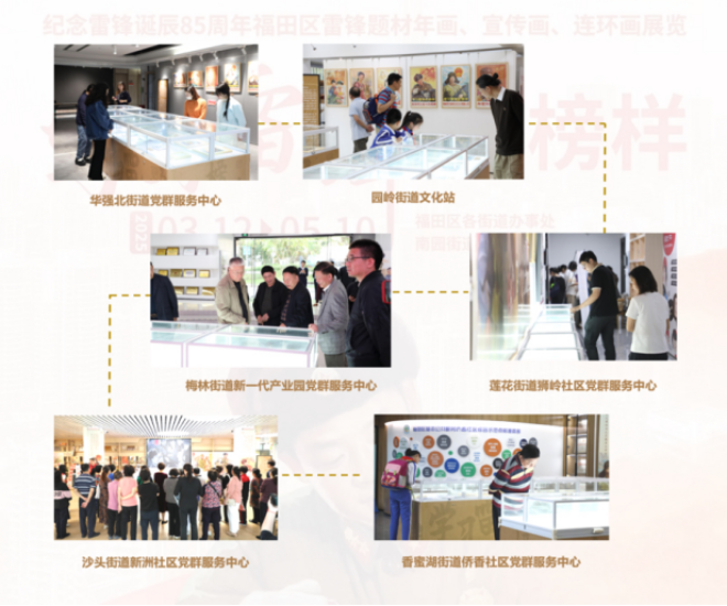 “学习雷锋好榜样-雷锋题材中国传统年画、连环画展览”巡展活动自3月启动,从南园街道首发,陆续走进福田区各街道,通过“移动展厅”的形式,将雷锋精神送到居民“家门口”。12块主题展板以时间为轴,系统梳理雷锋生平事迹、经典影像及新时代雷锋式人物案例,图文并茂地呈现“雷锋精神在深圳”的传承脉络,让不同年龄层观众在展览互动中感受精神共鸣。