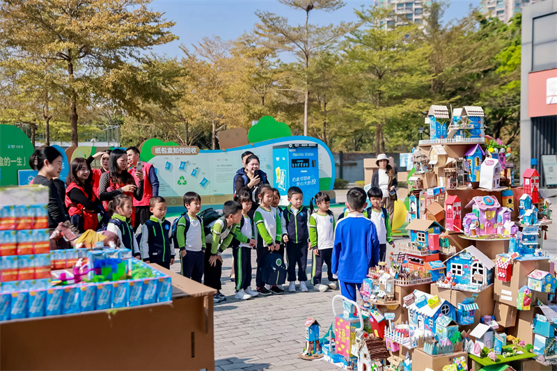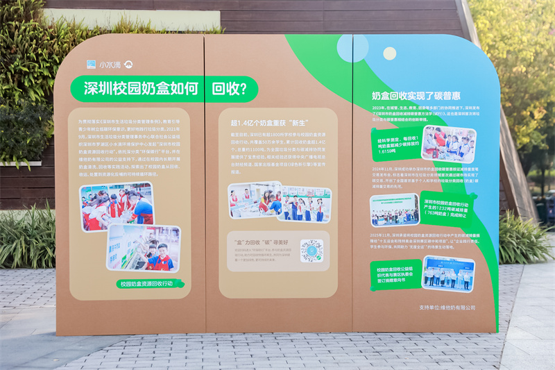 截至目前,深圳已有超1800所学校参与该项行动,共覆盖50万余学生,累计回收奶盒超1.4亿个,总重约1100吨。2023年6月,在城管、生态、教育、团委等多部门的协同推进下,发布了《深圳市奶盒回收减排碳普惠方法学(试行)》;2024年11月,完成了全国首笔1232吨奶盒回收碳普惠核证减排量交易;2025年11月,承诺将校园奶盒资源回收行动中产生的碳减排量捐赠给“十五运会和残特奥会深圳赛区碳中和项目”。