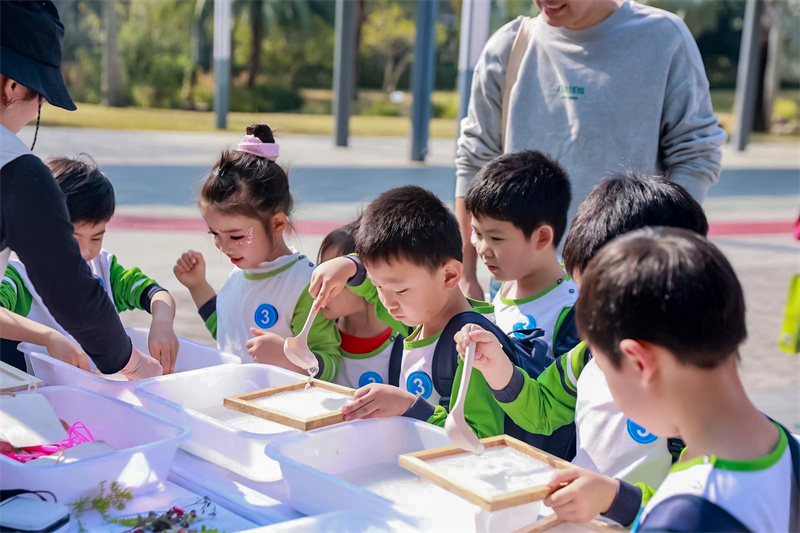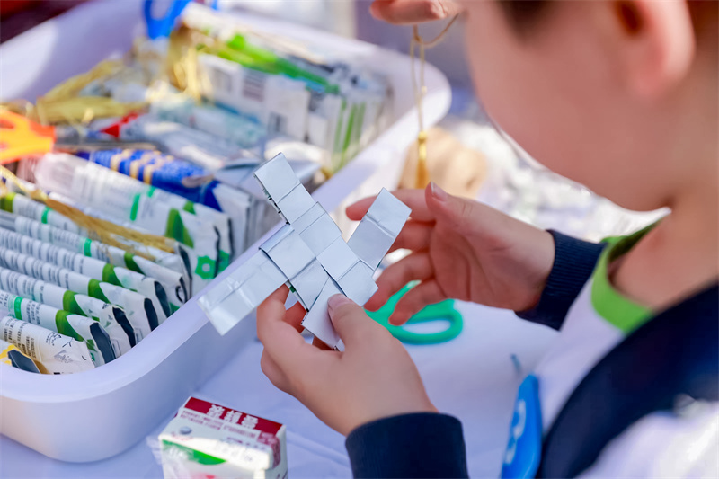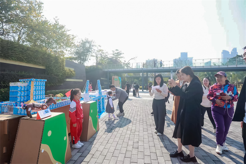 舞台区,福田区天健幼儿园萌娃带来的奶盒时装秀创意十足,用童真演绎环保理念;展览区,五大主题宣传展板全方位展示奶盒资源回收、再利用的完整链路,师生手工作品与环保再生产品错落陈列,让观众直观感受再生魅力;互动区,孩子们聚集在一起,用奶盒制作中国结迎接春节,通过非遗技艺将奶盒纸浆转化为精美再生纸画作,在动手实践中强化环保认知。