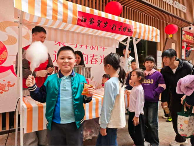 “家有喜饰”的衣架前,孩子们踮着脚,好奇地触摸着绣满各民族特色的繁花衣襟,在相视一笑间,定格下新春第一张别致合影。“甜蜜贺岁”的摊位上糖丝飞舞,志愿者们手持竹签,手腕轻旋,转眼便从糖勺中“扯”出一大团蓬松柔软的棉花糖,递到孩子们手中,化作一张张甜甜的笑脸。