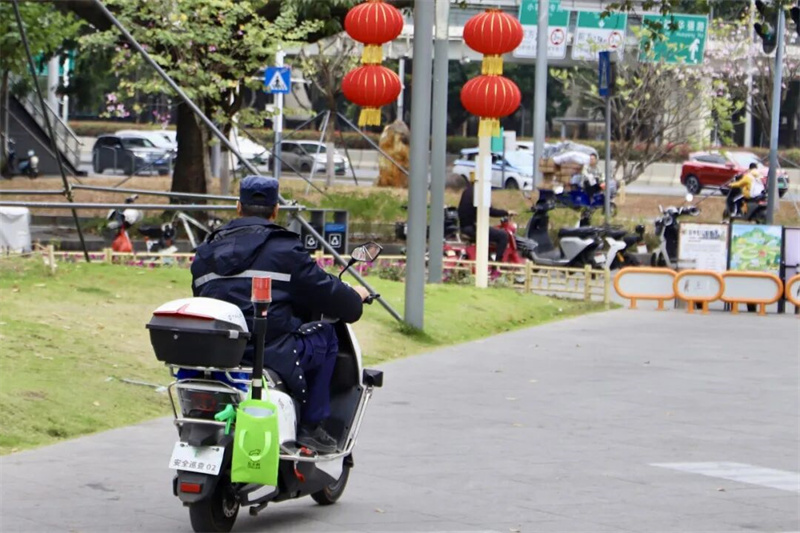 巡逻人员骑行在绿道上,在熙攘的人流中自如穿行,让守护保持“流动”的频率。这种及时的穿梭,确保了公园每个角落的安稳。车轮往复,不仅是速度的接力,更是给这份悠闲的游园时光,添了一份看得见的底气。
