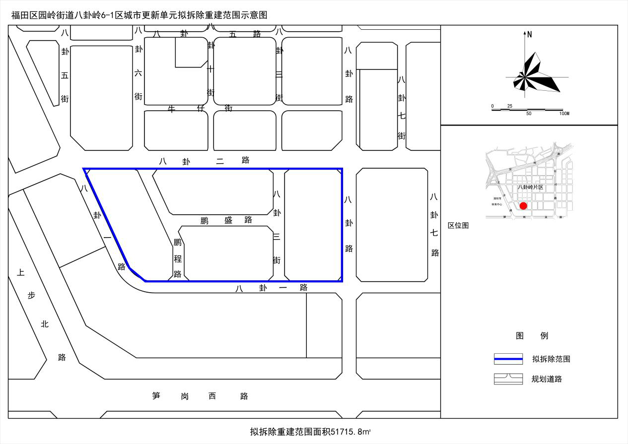福田区园岭街道八卦岭6-1区城市更新单元位于八卦岭八卦一路、八卦二路和八卦路围合区域,申报拟拆除范围用地面积51715.5平方米,拟拆迁建筑面积119686.73平方米。深业鹏基(集团)有限公司来文申请将该更新单元纳入城市更新单元计划,根据《深圳市城市更新办法实施细则》(深府〔2012〕1号)、《深圳市福田区城市更新实施办法》(福府规〔2020〕1号)等市、区相关要求,现将该更新单元拆除范围及更新意愿达成情况进行公示,具体事项如下: