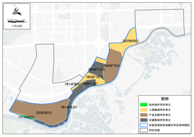 依据《区域空间生态环境评价技术指南》(DB4403/T 595-2025),在河套深港科技创新合作区深圳园区内划定4类9个评价单元,其中优先保护评价单元1个、人居敏感评价单元3个、产业发展评价单元2个、交通枢纽评价单元3个,河套深港科技创新合作区深圳园区内评价单元划分情况见表1及附件1。